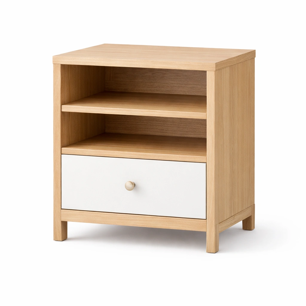 Material: Der Beistelltisch besteht aus hochdichter Spanplatte mit Eichenfurnier. Die Schubladenfront ist aus MDF mit matter weißer Lackierung.